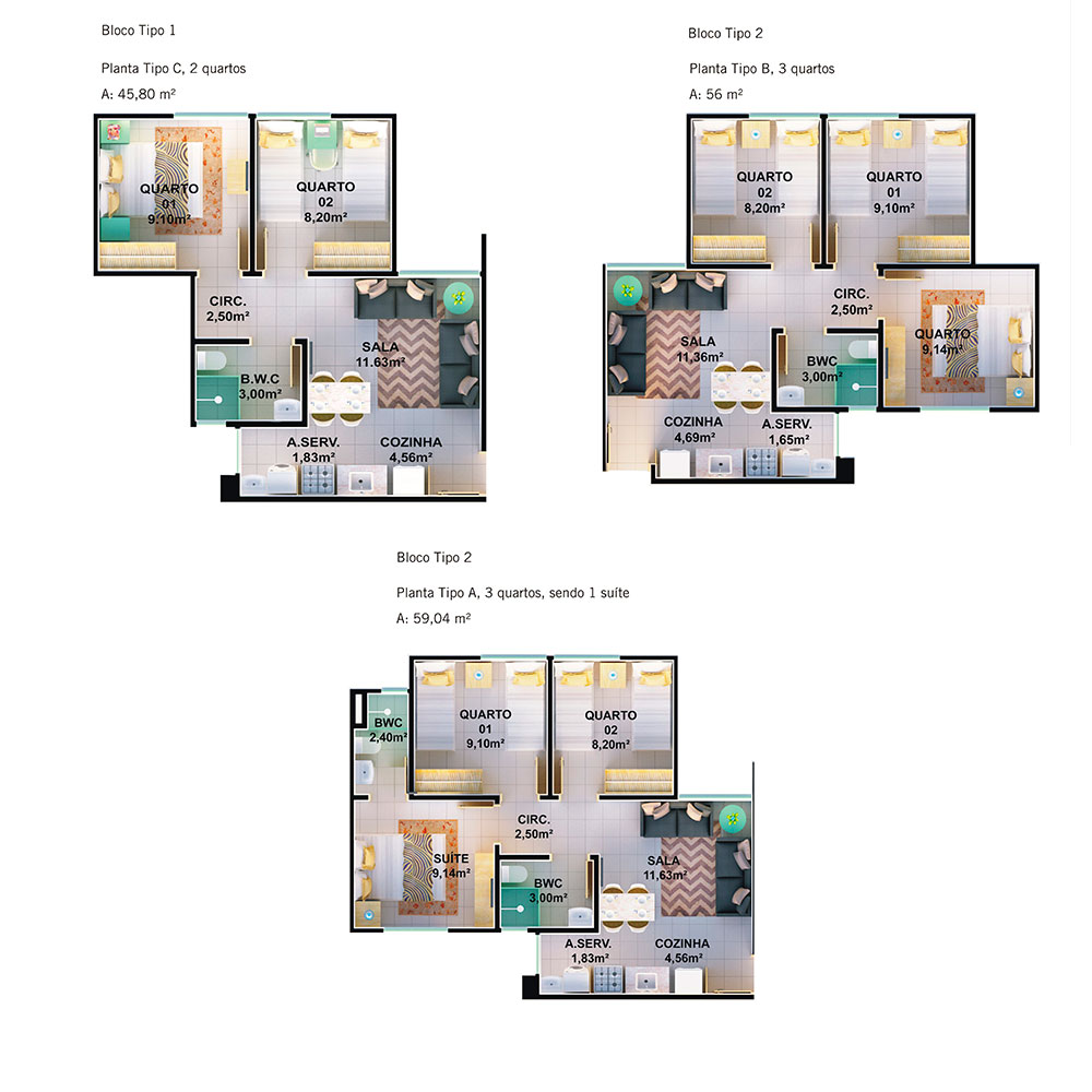 03 tipos de apartamentos com áreas de 59,04m², contendo sala, cozinha, área de serviço, circulação, 03 quartos, sendo 01 suíte e 01 banheiro social; de 56,00m², com sala, cozinha, área de serviço, circulação, 03 quartos e 01 banheiro social; e de 45,80m², com sala, cozinha, área de serviço, circulação, 02 quartos e 01 banheiro social.